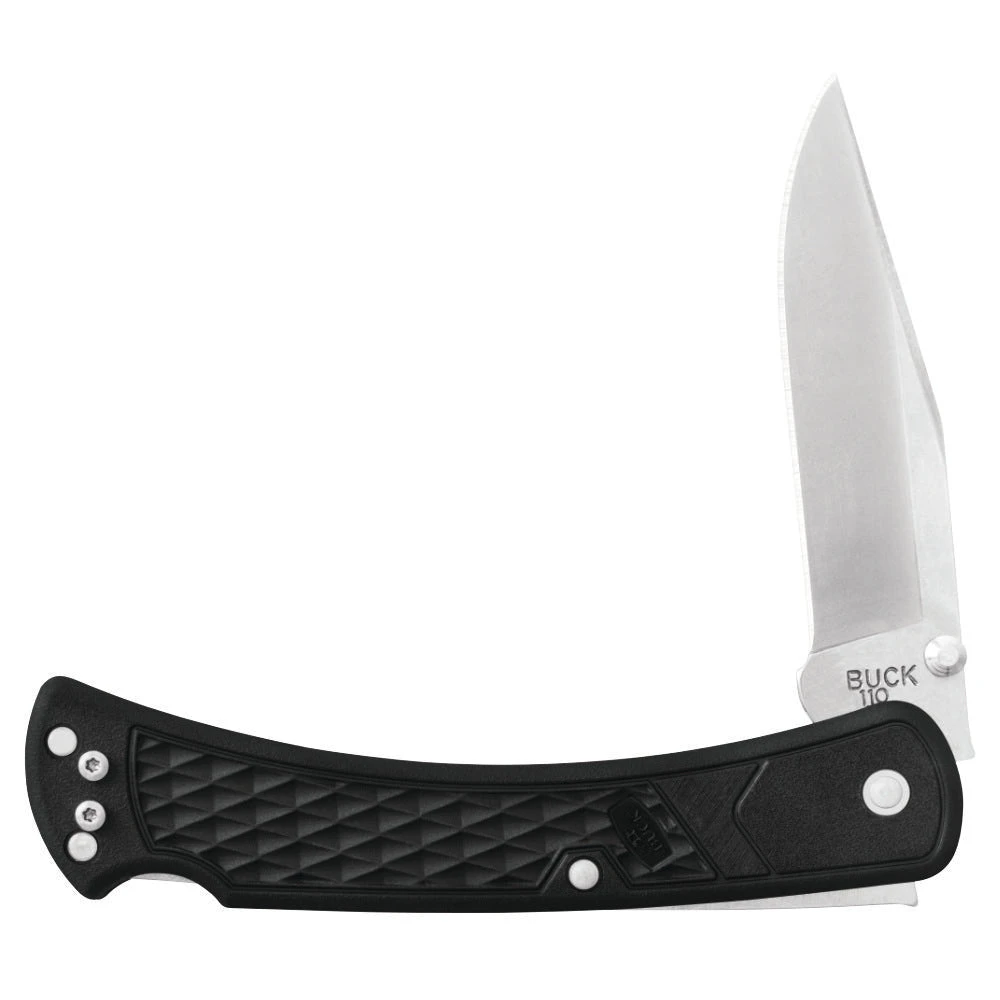 The 420HC blade is finished with Buck’s Advanced Edge2x Blade Technology, and has supreme edge retention. The 110 is easily opened with one hand using the dual thumb studs. It locks open when in use, and closes with a rocking lock bar mechanism. (To close the knife, push down on the button on the spine with one hand, and fold the blade closed with the other.)