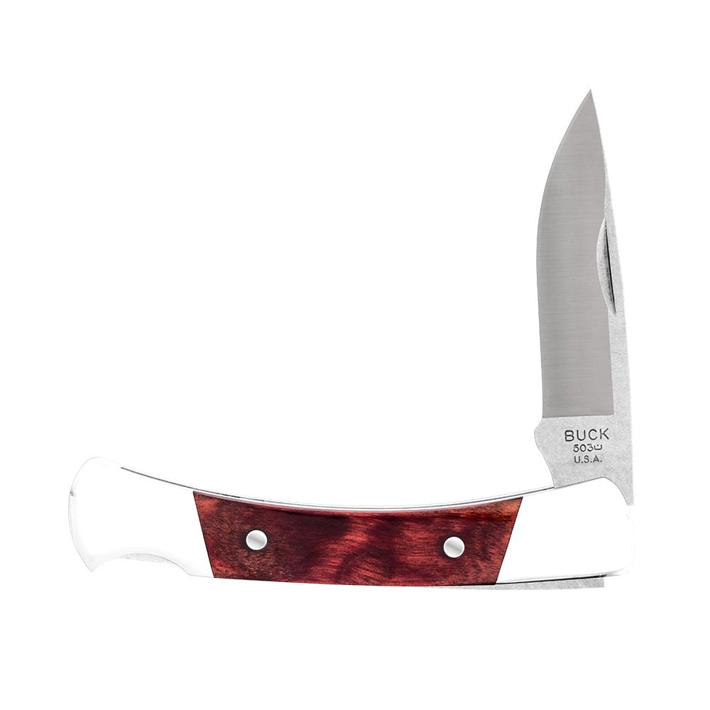 The Buck 503 Prince Knife is a classic, compact everyday carry with a drop point blade, a lockback design and an easy-open nail notch. The razor sharp blade is crafted from 420HC stainless steel, and the knife features DymaLux red wood handles with nickel silver bolsters. It is slightly smaller than the Buck Squire.