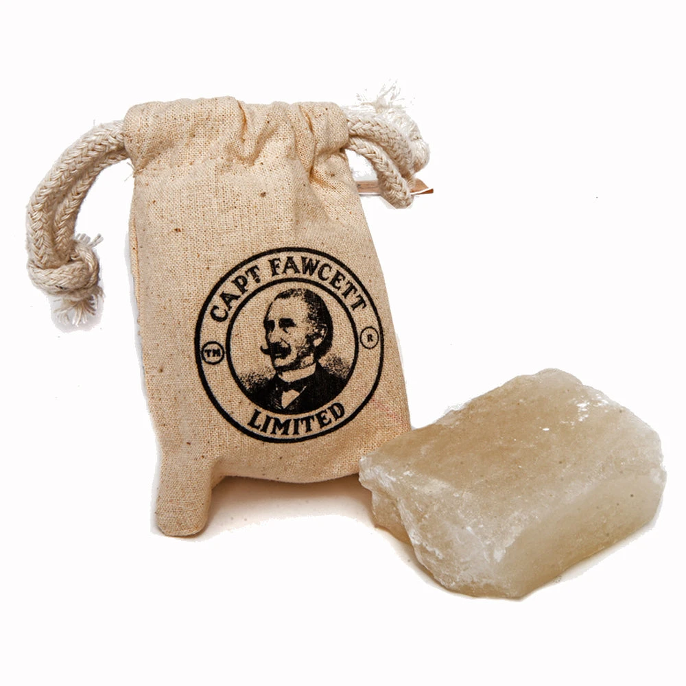 Captain Fawcett’s Traditional Alum Bar is a natural mineral bar that both soothes and heals your skin after shaving. Simply moisten the stone with cold water and run it gently over your face to close pores and reduce razor burn. This bar is also very effective at stopping the bleeding from small shaving nicks and cuts.