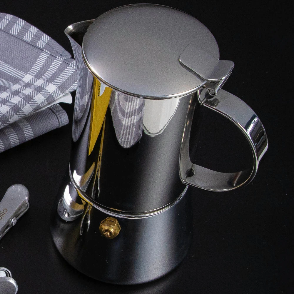 The Cilio 8.5 fluid ounce Aida Stovetop Espresso Maker brews the perfect cup of espresso easily on your stovetop, and its mirror-finished stainless steel is both practical and elegant – looking right at home in the kitchen or on your breakfast table.