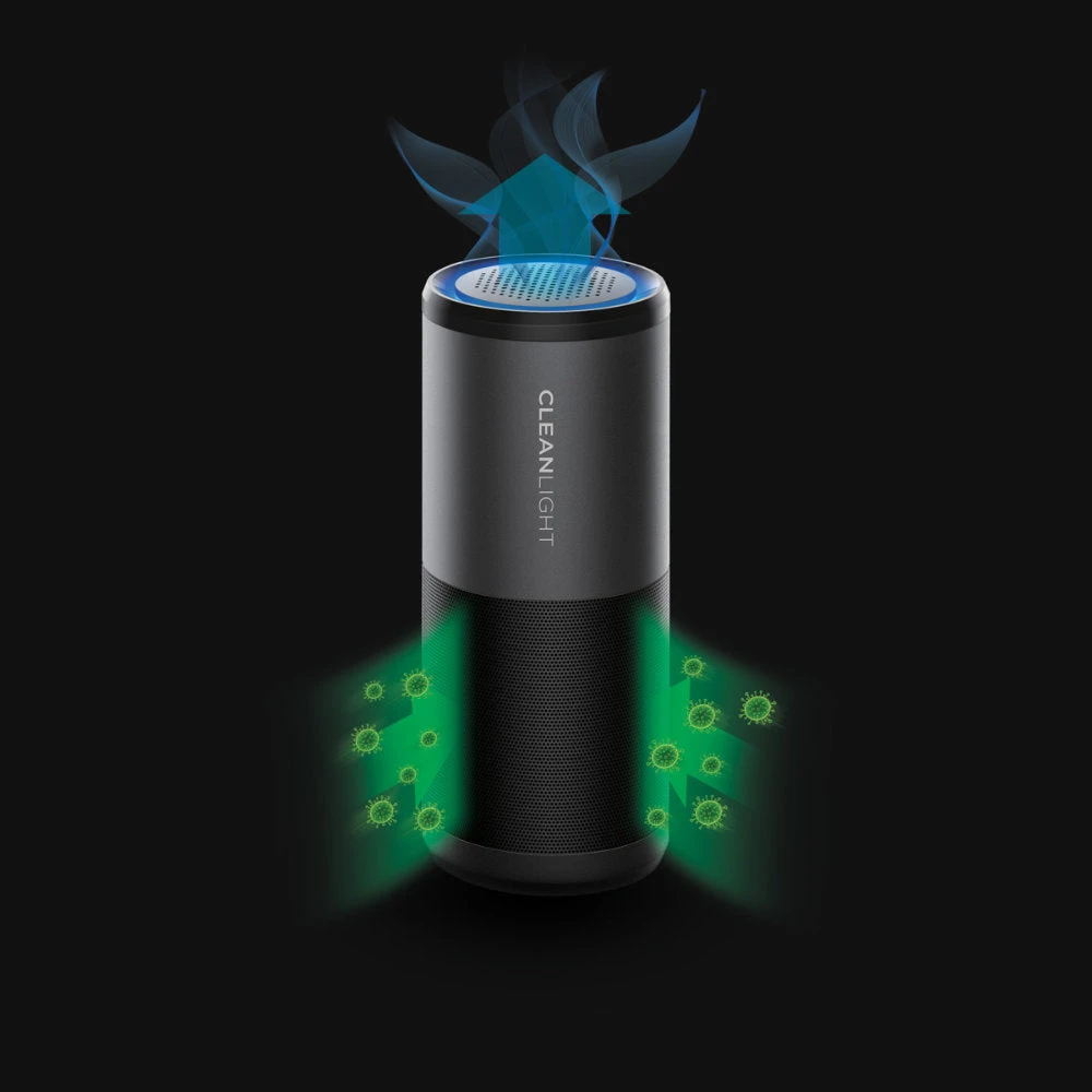 The CleanLight UV Air Purifier is a 360-degree air filter that uses UV-C rays that safely kill 99.99% of germs and bacteria, as well as an H13 HEPA filter to remove 99% of particles such as smoke, odors, dust, pet dander and air pollution.