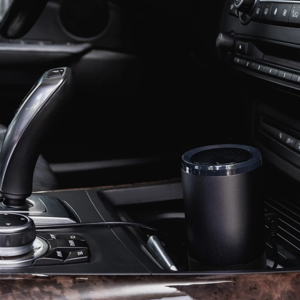 This compact air purifier is the size of a water bottle, and weighs under a pound. It is small enough to fit in your cup holder, but large enough to purify up to 161 square feet. It features both low and high fan modes, both of which are under 27dB.