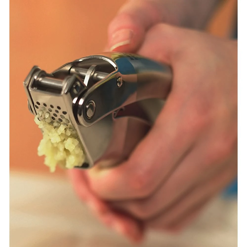 The Kuhn Rikon 6.5-inch Epicurean Garlic Press is a stainless steel press that crushes garlic effortlessly and cleans up quickly. A favorite of critics and chefs, the ergonomic handle is easy to grip and requires less force.