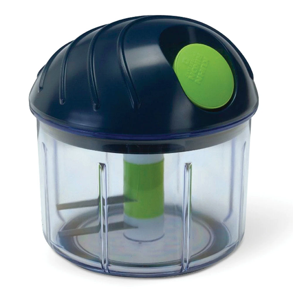 The Swiss Chop Chop by Kuhn Rikon is a feisty little chopper that has bigger chops than most food processors. Quickly and easily chop, mince or puree fruits, veggies or herbs to create dips, soups, sauces and desserts with a few effortless pulls of the handle. The pull-mechanism sets the the ultra sharp rotator blades into motion, and the more you pull, the finer the results.