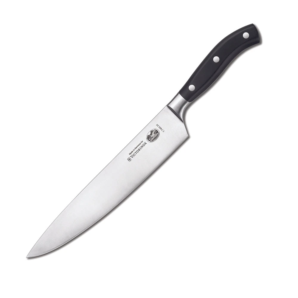 The Grand Maitre 10-inch Chef’s Knife by Victorinox features an ultra-sharp straight-edged blade that is adept at almost any slicing, dicing or chopping task. You will reach for this knife every time you set to work in the kitchen. The curved blade allows for rocking, and the width of the knife from spine to blade keeps your knuckles comfortably above the cutting board as you work. The demi-bolster on this knife allows for uniform sharpening of the entire blade, and also makes this knife exceptionally comfortable when using it with a pinch grip.